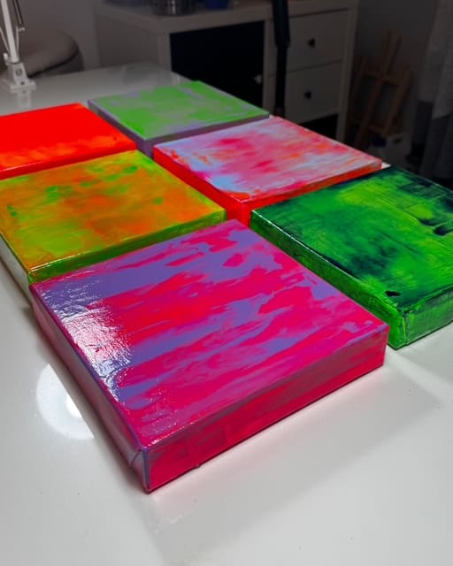 Neon Minis -Kleine Formate, große Energie. Frisch aus dem Atelier sechs kleine Werke auf Leinwand, die mit den leuchtenden Farben. Ob als Statement- Piece im Eingangsbereich oder farblicher Akzent im Wohn- oder Arbeitsraum. Die Neon Minis bringen Energie in jeden Raum und stehen exemplarisch für meine Leidenschaft für starke Farben und emotionale Tiefe.